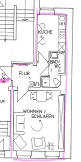 - Aufteilung der Wohnung: Wohn/- Schlafzimmer, Küche, Bad/WC und Flur