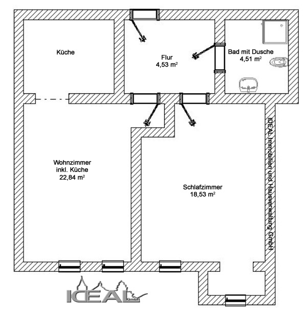 Aufteilung der Wohnung: Wohnen, Schlafen, offene Küche, Bad/WC und Flur
