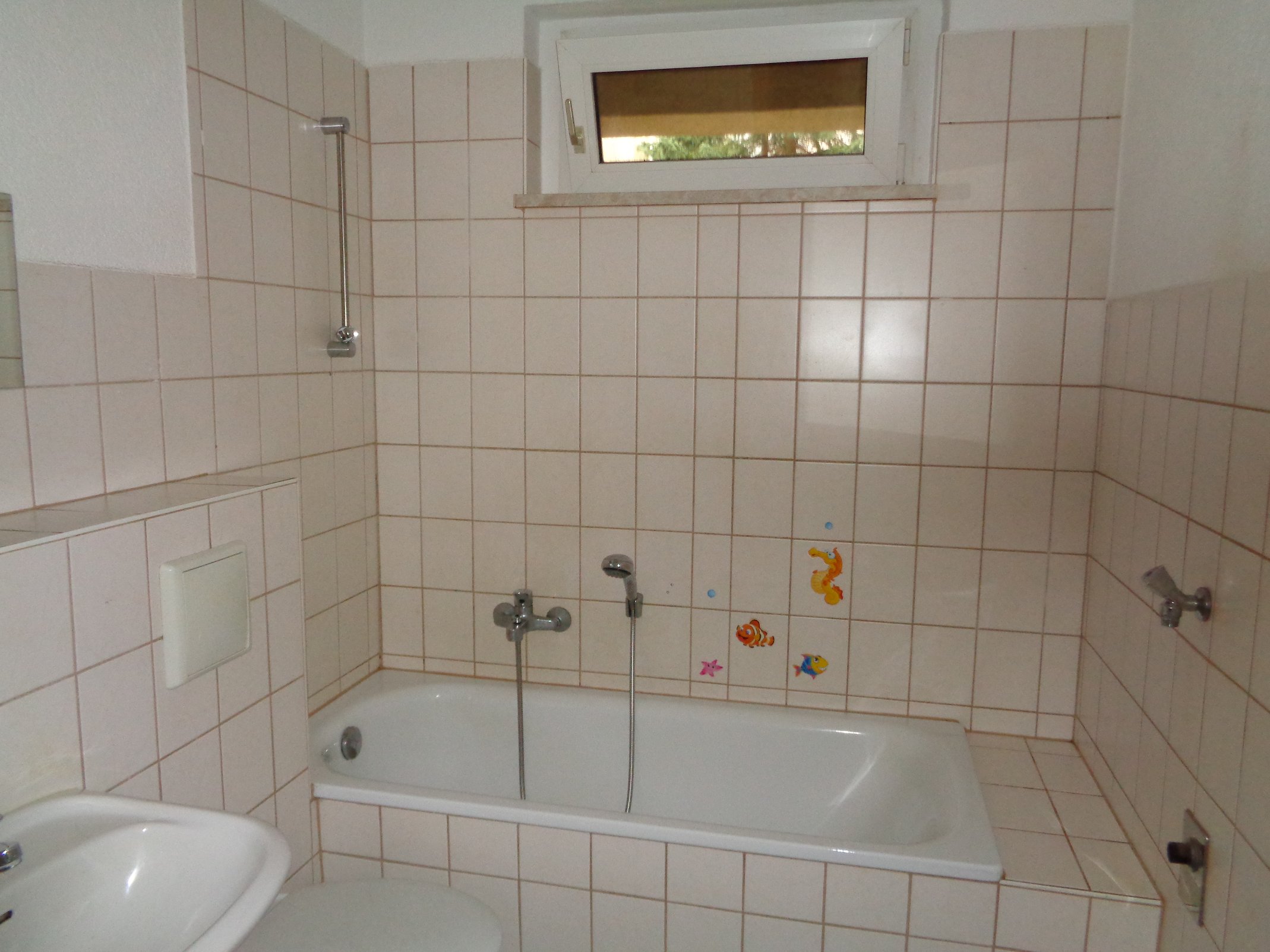 - gefliestes Bad mit Badewanne, Handwaschbecken, WC, Waschmaschinenanschluss und Fenster